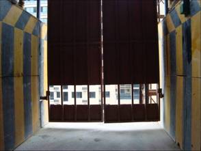 4、施工升降機進料平臺鋼板鋪設(shè),兩側(cè)模板防護。