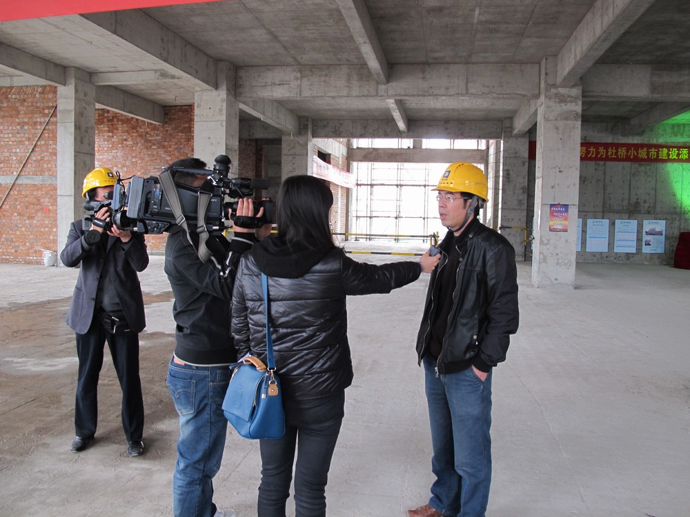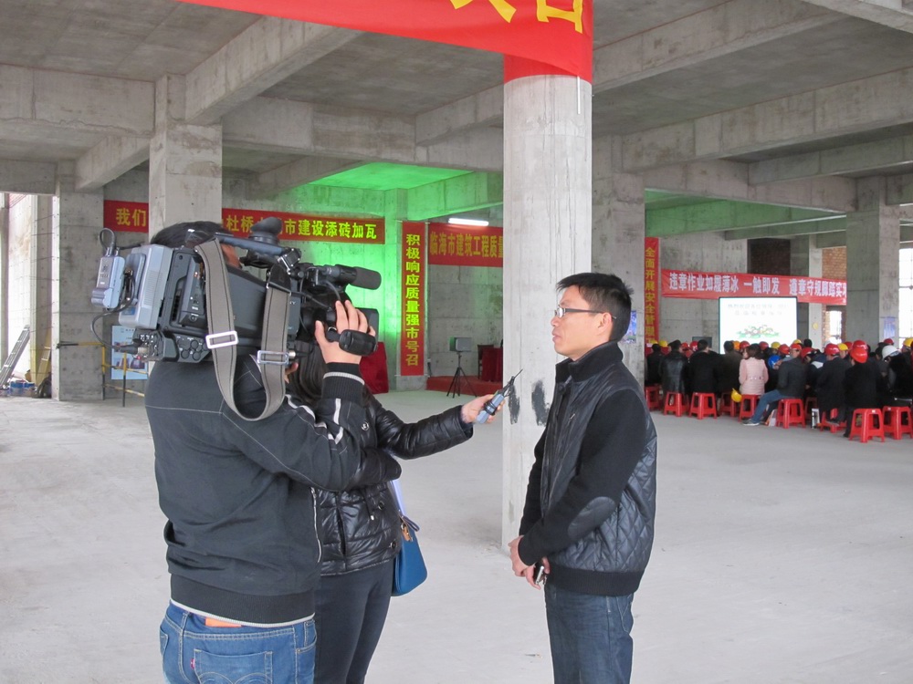 現(xiàn)場會時,臨海電視臺的記者采訪了市建筑工程質量監(jiān)督站站長葉青同志和我公司副總經(jīng)理王國棉同志。葉青同志認為東部很多工程項目都是招商引資過來的,大多是外地的建設單位和施工單位,對我們當?shù)匕踩芾硪?guī)定不是很熟悉,以這個工地為標桿,開展樹標桿學標桿活動旨在提高東部區(qū)塊施工現(xiàn)場的管理水平。王國棉同志著重介紹了該工程安全方面的一些亮點,如臨邊防護、電梯井、洞口防護都采用定型化、工具化的產品。工程現(xiàn)場布置人性化,特別是在三樓預埋構造柱的鋼筋周邊加了圓形保護筒,一則防止對鋼筋的破壞,二則安全防護,防止人不小心踩上去。