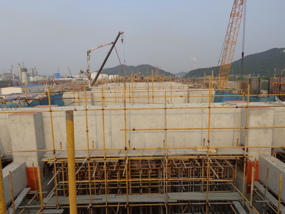 PDH裝置是寧波海越丙烷與混合碳四利用項(xiàng)目的核心裝置,而反應(yīng)框架是PDH裝置標(biāo)志性的建筑,自2013年1月16日開工以來,一直受到業(yè)主、監(jiān)理、EPC的高度關(guān)注,它全長114米,寬26米,高33.25米(其中基礎(chǔ)高13米),具備柱子(1000×2700)、梁(1500×2600)截面大,支模架高度高(13.411米),承重架搭設(shè)量大,地腳螺栓和預(yù)埋件數(shù)量多且大(預(yù)埋件單塊最大重1.5t)的特點(diǎn),同時(shí)涉及到高大模板及其承重體系、地腳螺栓安裝、大體積混凝土澆筑等多項(xiàng)專項(xiàng)施工方案的編制以及論證,且受施工工期緊、作業(yè)面及操作面狹小、施工過程中雨天頻繁、施工工藝操作難度大等因素影響,但寧波海越項(xiàng)目部堅(jiān)持發(fā)揚(yáng)“一家人、一條心、一股勁、一個(gè)目標(biāo)”的精神,項(xiàng)目部上下齊心合力克服重重困難,積極調(diào)動(dòng)各方資源力量,與班組緊密合作,精心組織,合理安排,不僅保證了反應(yīng)框架的進(jìn)度控制點(diǎn),而且施工實(shí)體質(zhì)量和表觀質(zhì)量也得到各方的高度評價(jià)。反應(yīng)框架優(yōu)質(zhì)的施工質(zhì)量在施工過程中曾多次作為樣板工程供海越丙烷與混合碳四利用項(xiàng)目各總包單位和分包單位觀摩的對象,且2013年4月我項(xiàng)目部憑著反應(yīng)框架的出類拔萃的混凝土質(zhì)量以及高度精準(zhǔn)的地腳螺栓預(yù)埋工作,被評為2013年浙江省工程建設(shè)優(yōu)秀質(zhì)量管理小組。