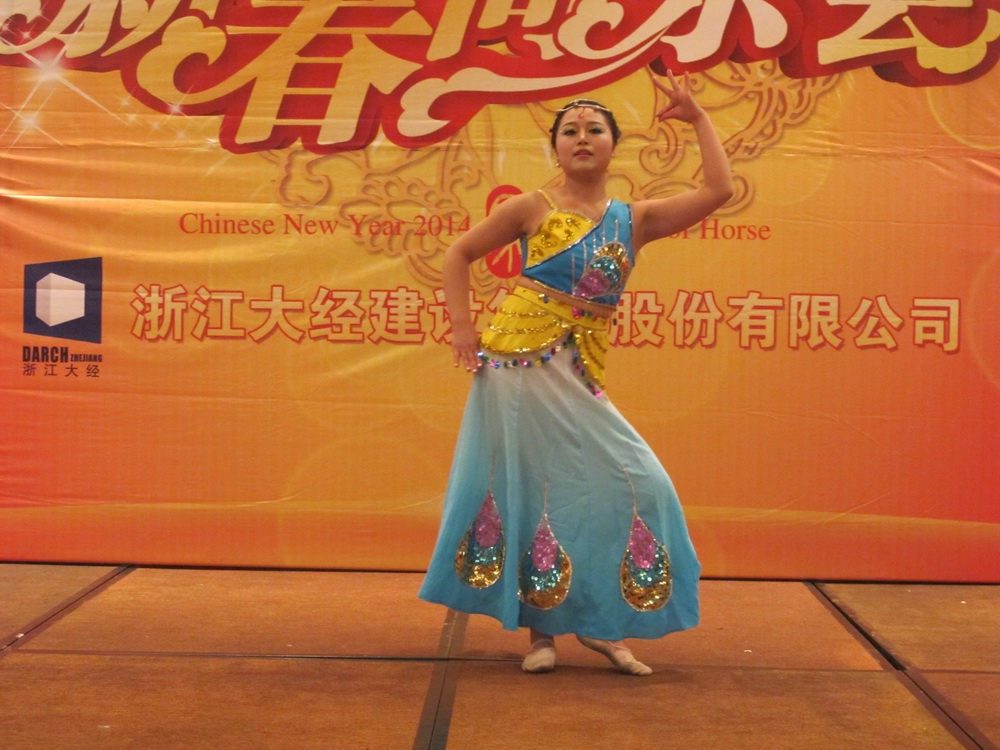 財務(wù)部實習(xí)生韓佳迎表演傣族舞。 金望杰高舉橫幅,祝大家馬到成功。